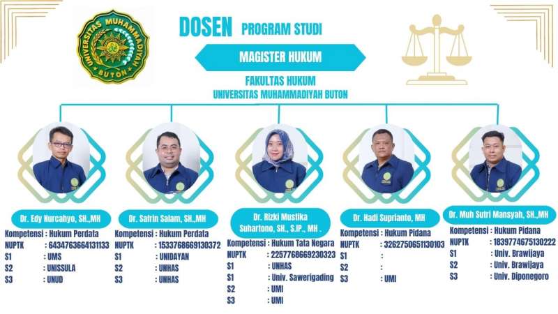 Sebagai bagian dari komitmen kami dalam memberikan pendidikan yang berkualitas, data ini disusun untuk memberikan informasi kepada mahasiswa, calon mahasiswa, serta masyarakat luas mengenai tenaga pengajar yang mendukung keberlangsungan proses pembelajaran di Program Studi Magister Hukum, Fakultas Hukum, Universitas Muhammadiyah Buton (UM Buton).